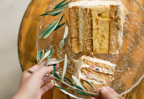 Нижний ярус- медовый бисквит,прослойка из апельсинового джема,мусс из лимонного шоколада,мусс из манго с экзотическими фруктами. Верхний ярус- медовый бисквит,сырный крем, голубика,клубника. Верх торта украшен сырным кремом.