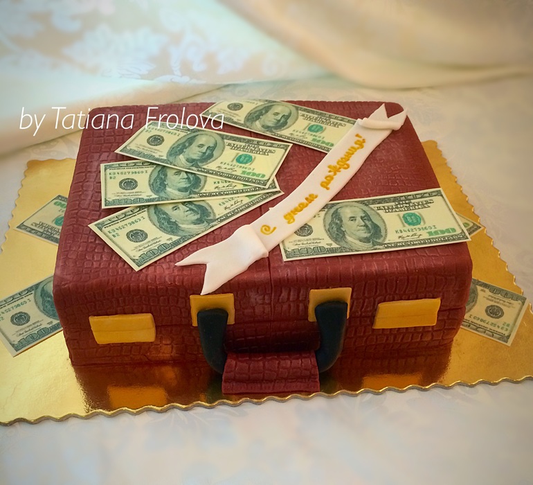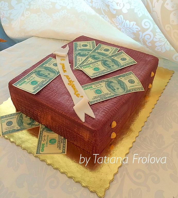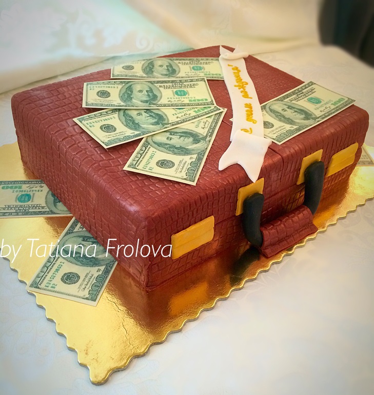 Торты для мужчинСладкий чемодан с деньгами)) за денежки отдельное спасибо Олечке (Триня СК). Внутри ванильный шифоновый бисквит со сливочной пропиткой, крем сметано-творожный со свежими персиками, и суфле клубника со сливками. Вес 3,8 кг.