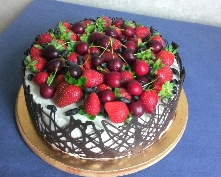 Украшение тортов кремом,шоколадом, фруктамиИспекла тортик для сестренки. Шоколадную ленту делала впервые. Раньше думала, что это очень сложно, на деле оказалось проще. Ванильный бисквит на кипятке. Пропитка курд из жимолости, клубника со сливками. 3,5 кг.