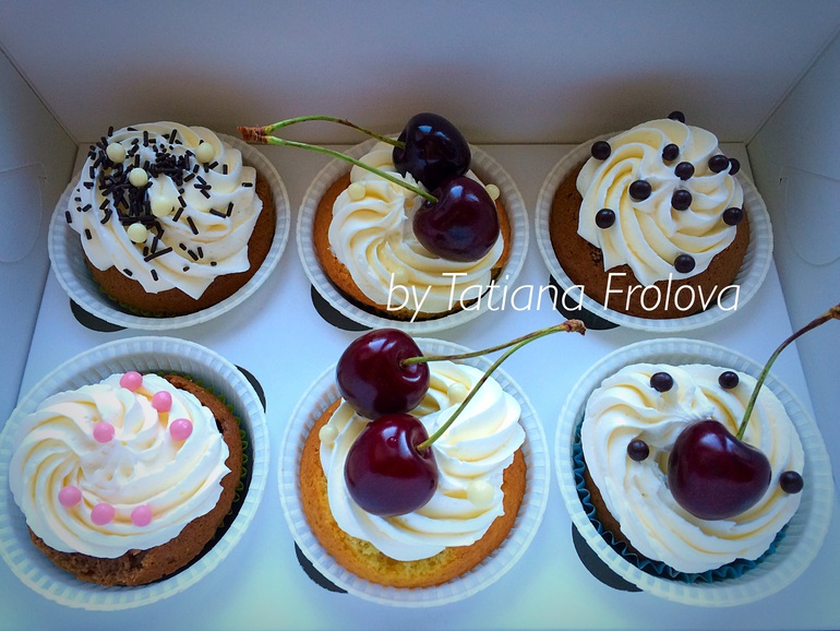 Капкейки и КейкпопсыВанильные и шоколадные, с карамелью и ореховым пралине. Шапочка из швейцарской меренги, украшен шоколадом и черешней.