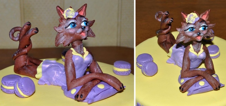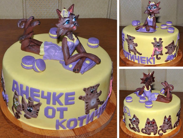 Торт для девушки , у которой много друзей, все они абсолютно разные и она зовет их "котички". И любимые цвета героини - желтый, фиолетовый, розовый, голубой.