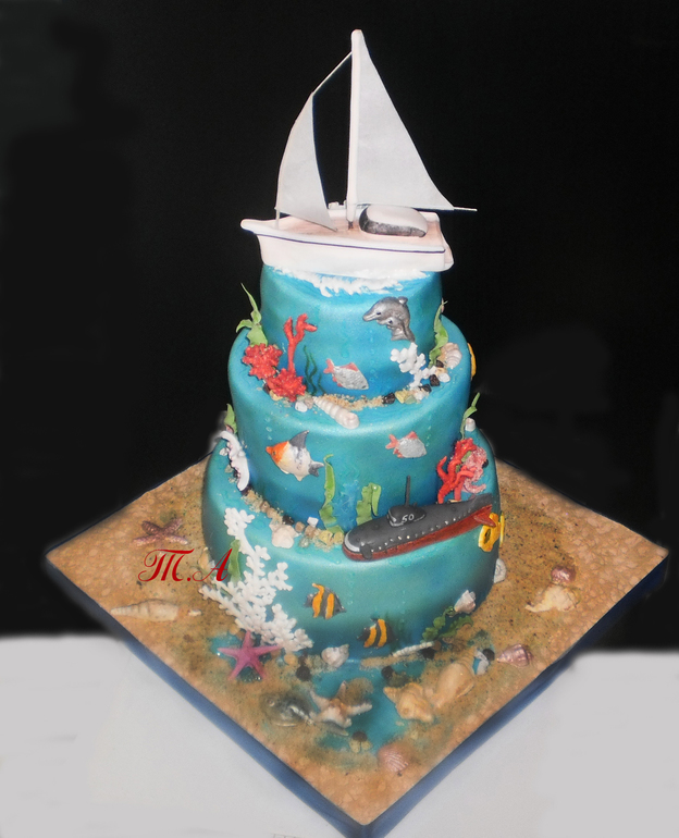 Торт на 50 лет. это обозначено на подводной лодке. Мужчина всю жизнь провел в море и в глубинах моря. Заказчики попались очень замечательные. практически полностью мне доверили оформление торта. Единственное что просили-это подводную лодку и море. Ну вот я решила сделать все в едином целом. Волны под яхтой. это изомальт. все остальное мастичные изделия.