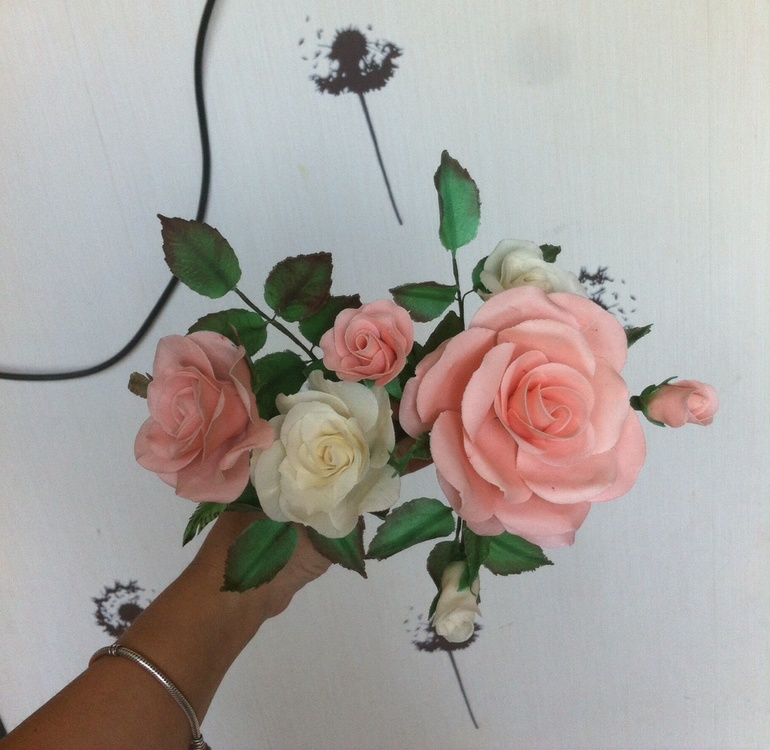для самостоятельных роз — отлично! но...я дама вредная))) 1. у листа розы нет черенка, надо было сразу лист прикручивать к стеблю2. лепестки толстоваты, их надо утоньщать шариком3. цветы, любые, смотрятся живыми, когда их оттонируешь ( и тут даже толщину можно спрятать)))