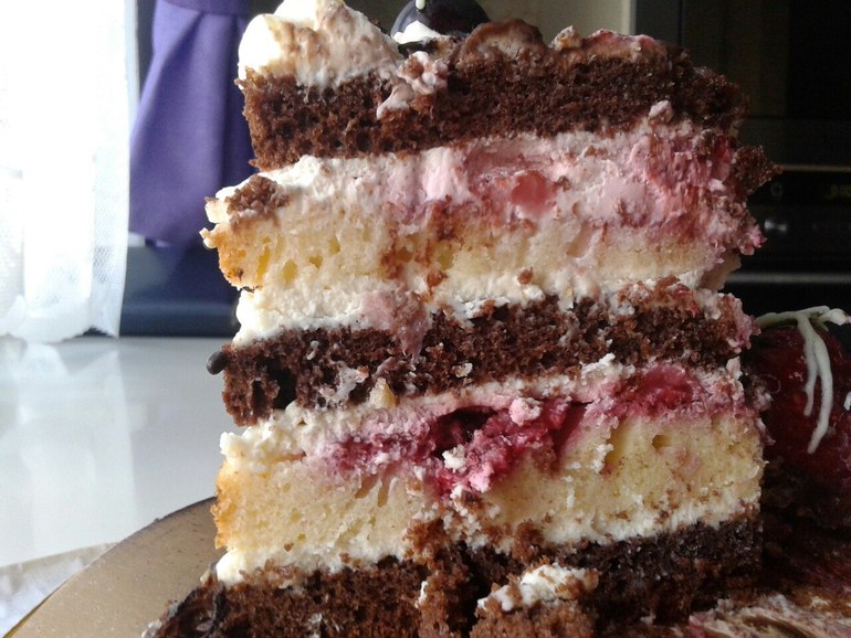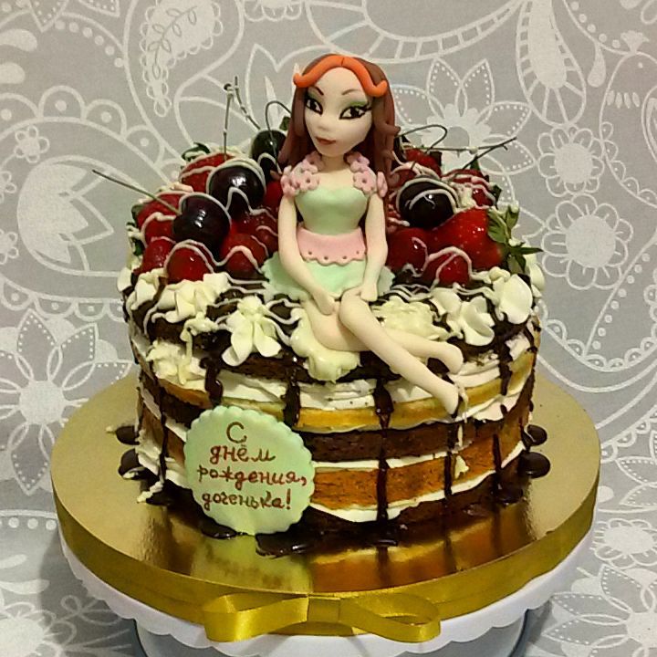 Украшение тортов кремом,шоколадом, фруктамиили как их еще называют "голый торт". Лето самое время время для таких тортов. Они всегда легкие, красивые и очень очень вкусные. Шоколадные и ванильные коржи, крем чиз, малина и клубника. Ну а надпись и куколка делают его именным. Под катом разрез.