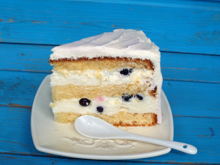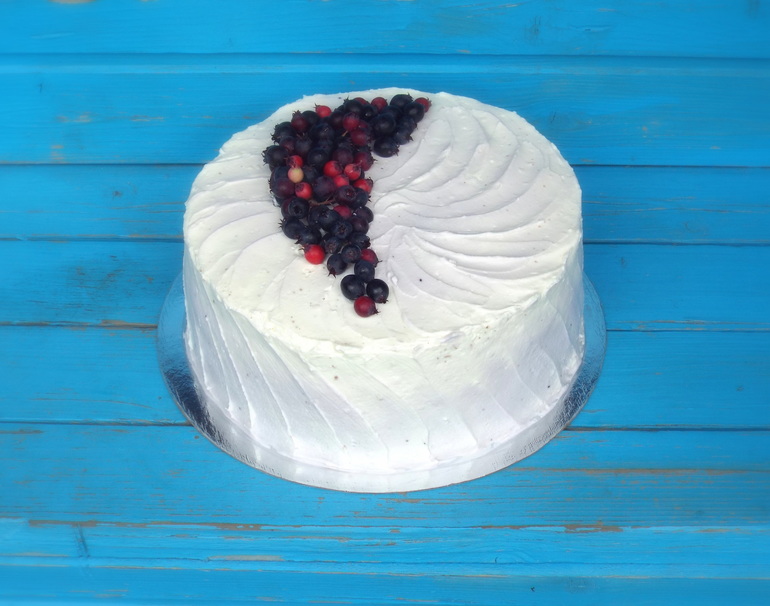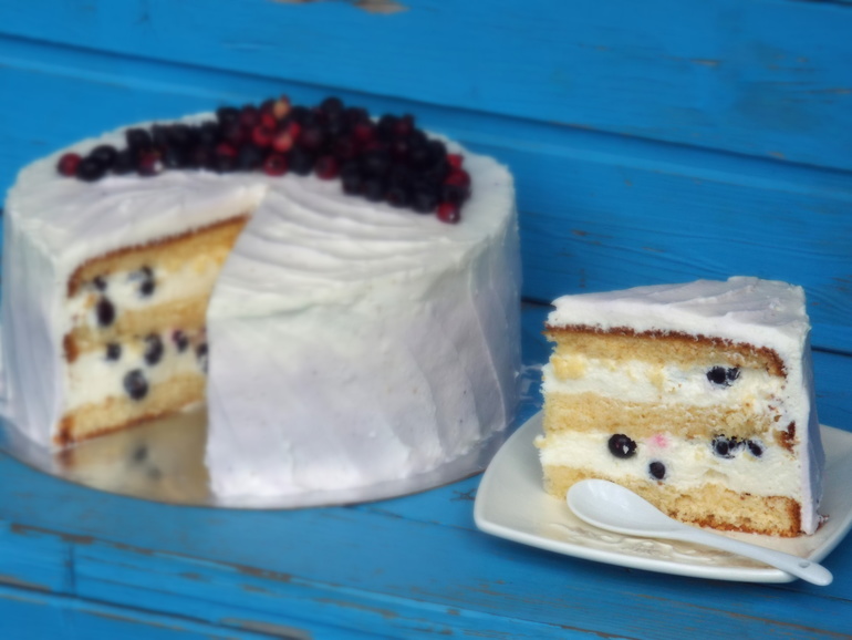 Ванильный шифоновый бисквит,попробовала на молоке,вывод мне на воде больше нравиться.Пропитка сиропом,суфле йогуртовое,ну и ягодку добавила,смородину.Сверху ягода ирга..эх..дача..дача..