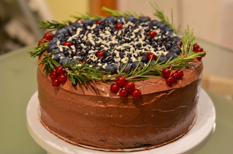 Шоколадные бисквиты на кипятке , в прослойке творог со сливками , какао и растопленный шоколад и много много вишни . Сверху покрыт шоколадным крем-чизом (это моя любовь теперь), свежие ягоды голубики, черники и красной смородины , тертый белый шоколад и веточки розмарина