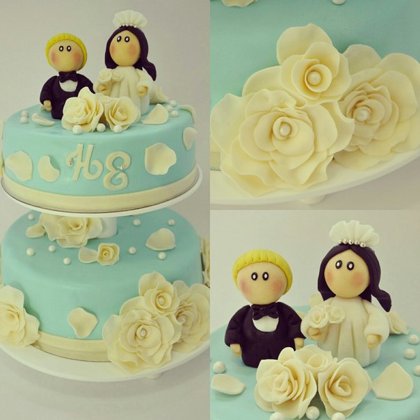 Торты свадебныеНежный свадебный торт в стиле TIFFANY. Необычные фигурки жениха и невесты, ручная лепка! Вес: 6 кг. Верхний ярус ванильные коржи ,йогуртовый крем с клубникой, нижний ярус творожно-сметанный крем , клубника и персики .