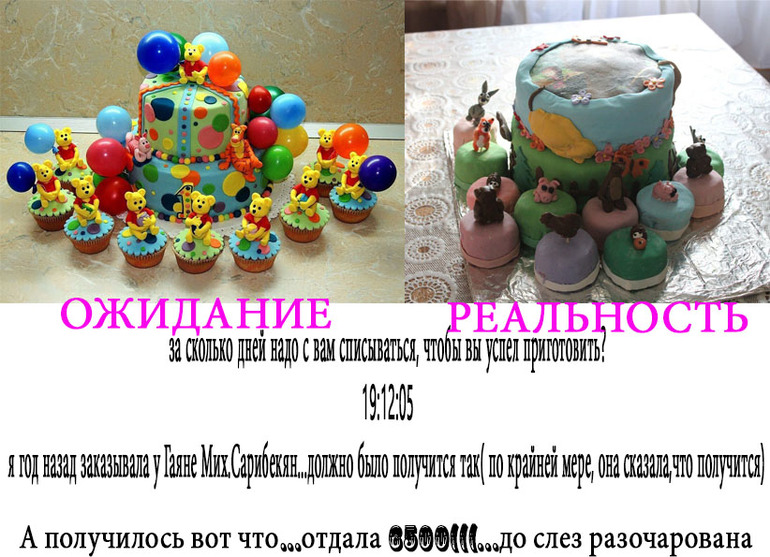 А мне интересно, чего ждут люди, видя какие работы у "мастера"? У нее на странице все сразу ясно. Такого, как на образце и ждать не следовало. Если хотите красивый торт, то не гонитесь за низкой ценой