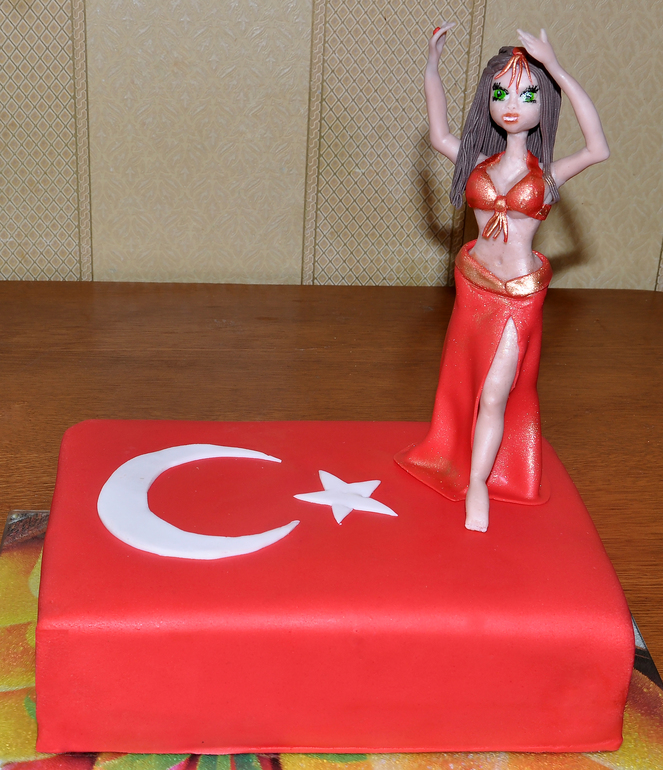 Давно обещала себе не брать срочных заказов - не выровнять толком, ни украсить. Но тут коллега с работы мужа, слезно просила торт - идет знакомится с родителями жениха, у него еще и день рождения. Жалко стало, согласилась. В ночи успела выпечь бисквит, с утра за продуктами для крема и к вечеру уже отдала. Выравнивание конечно страдает, жара - а торту и выстояться было некогда... Но что смогла сделала - молодой человек увлекается Турцией, отсюда такая тематика.