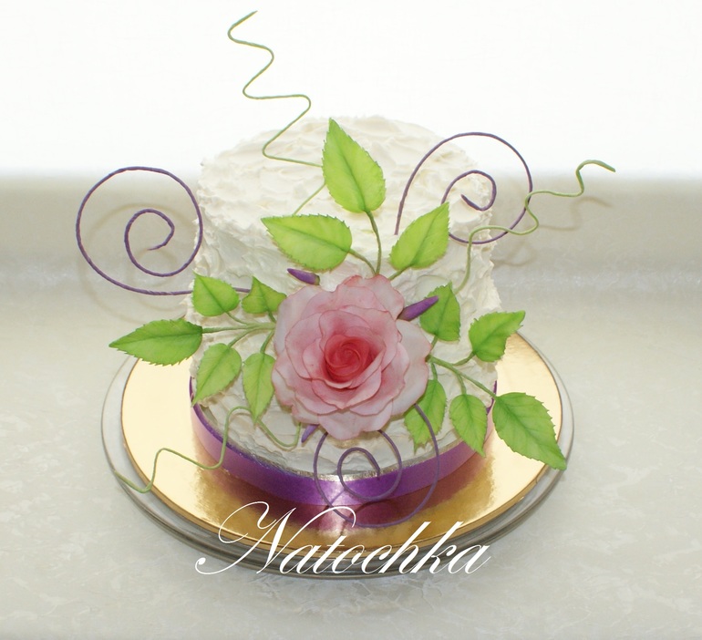 Добрый день девочки, вот у меня и второй срочный тортик появился.... . Подружка вчера днем попросила на сегодняшнее утро приготовить тортик к чаю....... Я решила заодно поэкспериментировать, все мечтаю научится правильно наносить крем, чтоб типа мазками получались (в интер-те М.К. не нашла). В результате я ей сделала на пробу два торта в одном (типа двухэтажный), роза у меня была готовая, все остальное налепила, что смогла к 9 утра..... В общем получилось не очень, что хотела, но, зато- ОПЫТ.