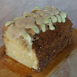 Выложить бисквит более широкой стороной на доску и срезать уголки, придавая кругловатую форму. Обрезки измельчить в блендере и обжарить в духовке до коричневого цвета минут 10-15 при 200 градусах. Остывшую крошку перемешать с 1 ч.л. какао.
