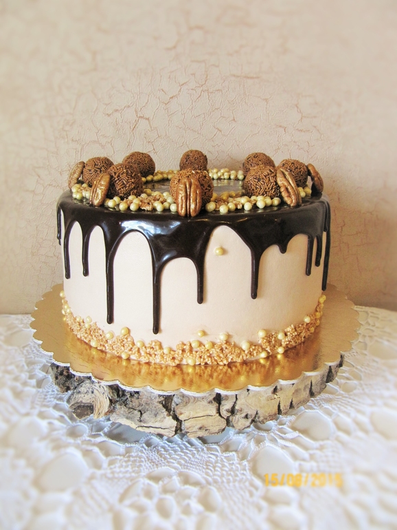 Украшение тортов кремом,шоколадом, фруктамиТорт в подарок заказала дочь, по совместительству моя подруга, для своем мамы, чудесной женщины, которая пережила очень много в своей жизни, хотелось сделать торт в виде ювелирного украшения, получилось но не все, и в живую он смотрится лучше, блестит больше))) золотой цвет.