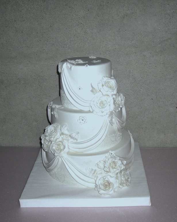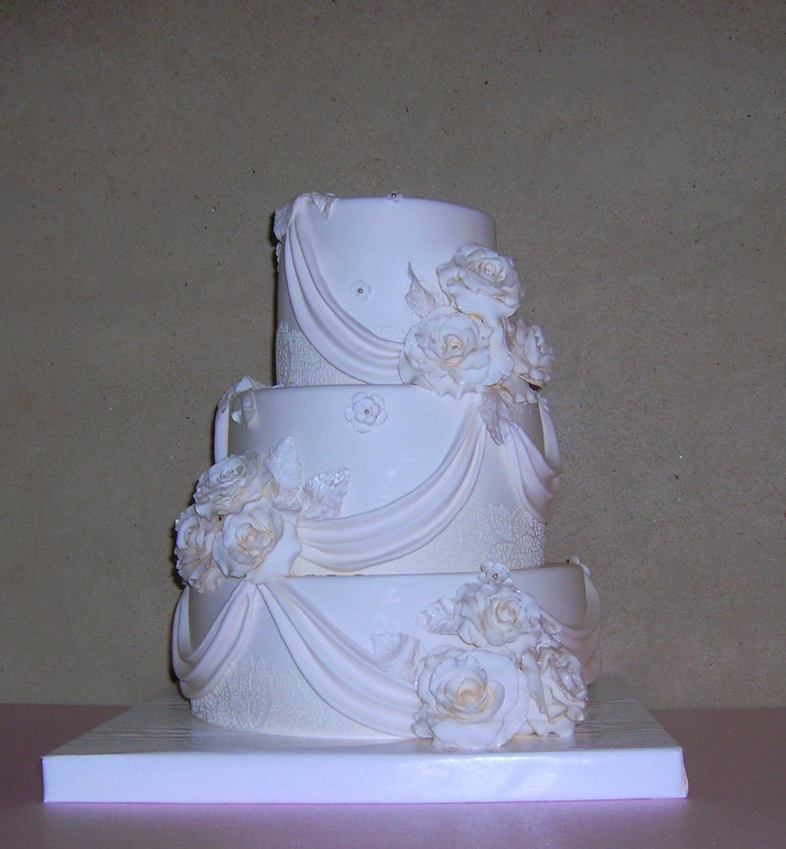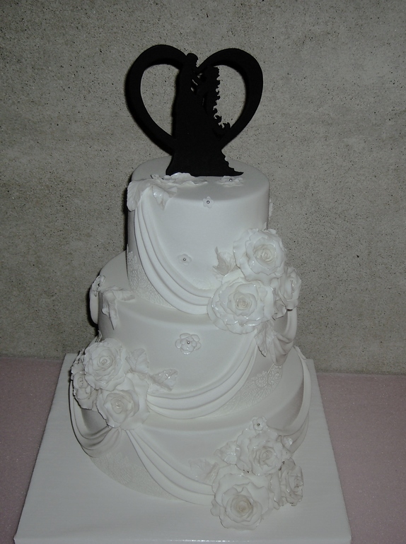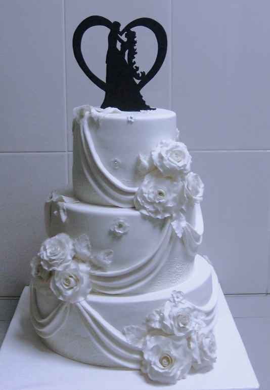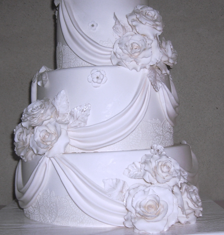 - торт делался долго и мучительно.. с постоянными уточнениями у клиента .. оттенять цветы строго запретили - чисто белый.. но потом разрешили немного серебра добавить.