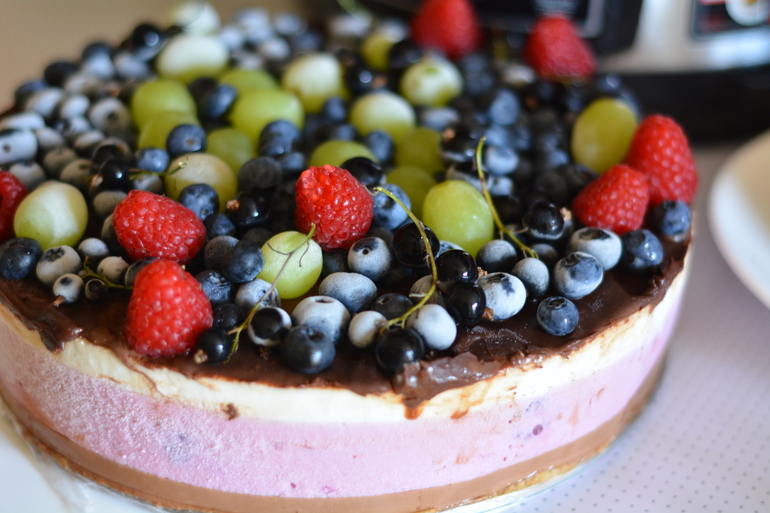 Основу сдeлала из крошки савоярди и слив масла, потом 1 слой - молочный шоколад, 2- малина ( и ягодки цeликом) + мягкий творог + сливки 10%, 3 слой - творожный крeм со сливками 35%, свeрху ганаш и фрукты.