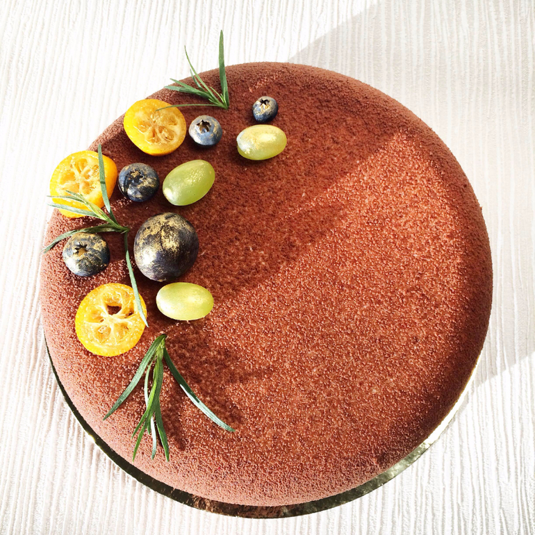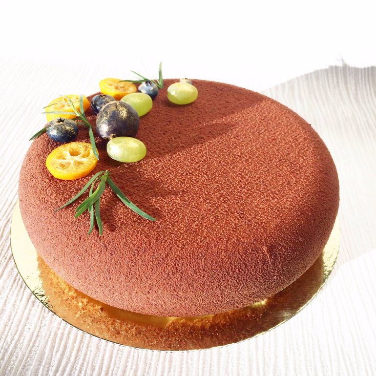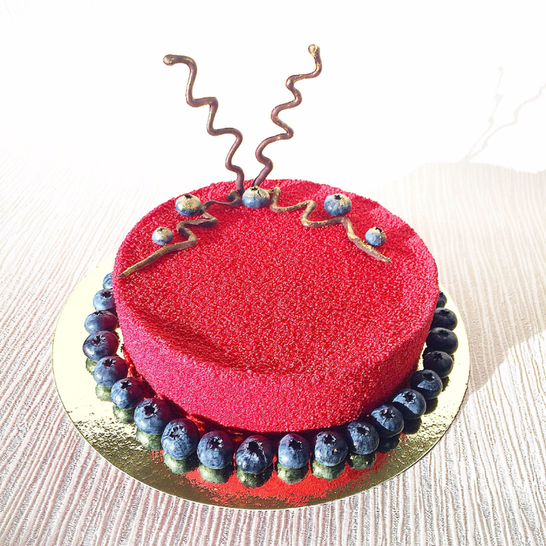 Внутри: шифоновый бисквит, ягодное конфи, ванильный мусс с белым шоколадом.