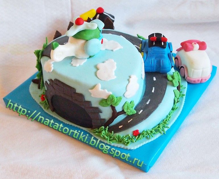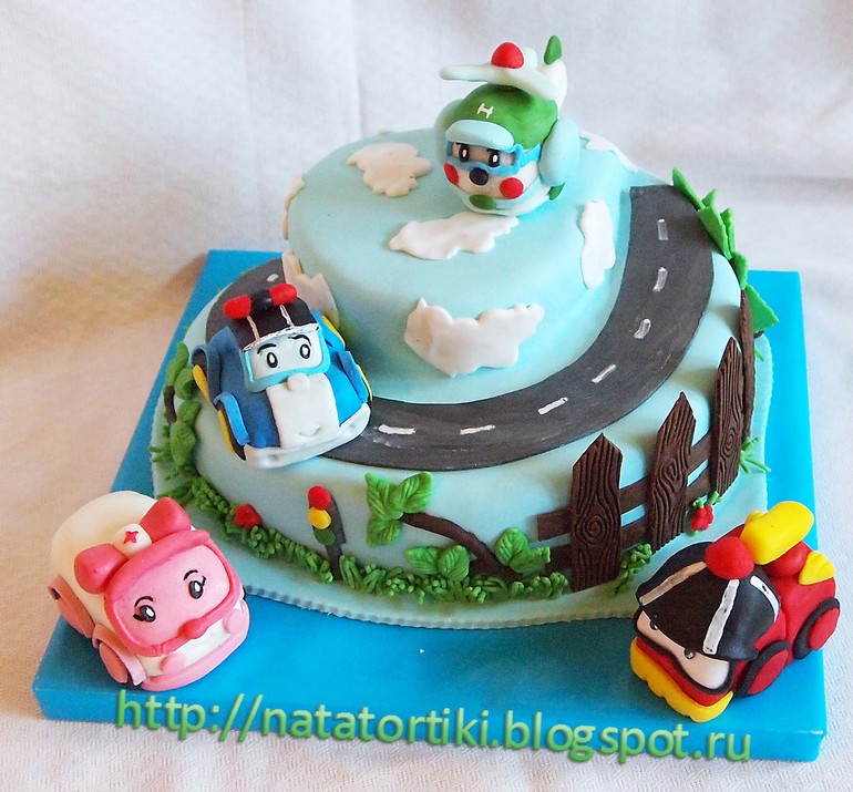 Тортик Робокар Полли. В машинках воздушная пшеница, вес с фигурками 3 кг, начинка молочная девочка с вишней. К тортику еще были капкейки.
