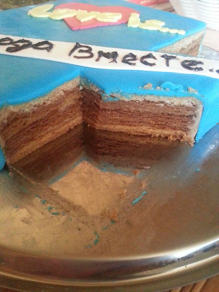 Делала медовик, и покрывала покупной голубой мастикой. Ооооох и намучилась я с этой мастикой. Раскатывала, только поднимала и она рвалась. Стала покрывать и тоже трескается, короче, больше не буду такую покупать(((( Сколько кг тортик, тоже понятия не имею. Заварной крем делала и "пыталась" выравнивать масло + крошка от коржей и чуток сгущенки. Выравнивать этой картошкой понравилось)) Хотела сделать в виде жвачки love is, но коржи с кремом осели (а было 16 больших коржей) и сделала,что вышло))). Ну вот собственно и мой торт)))