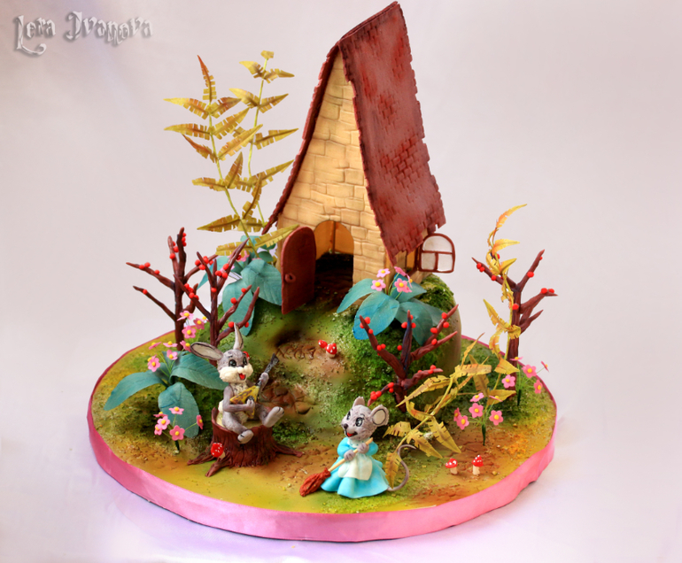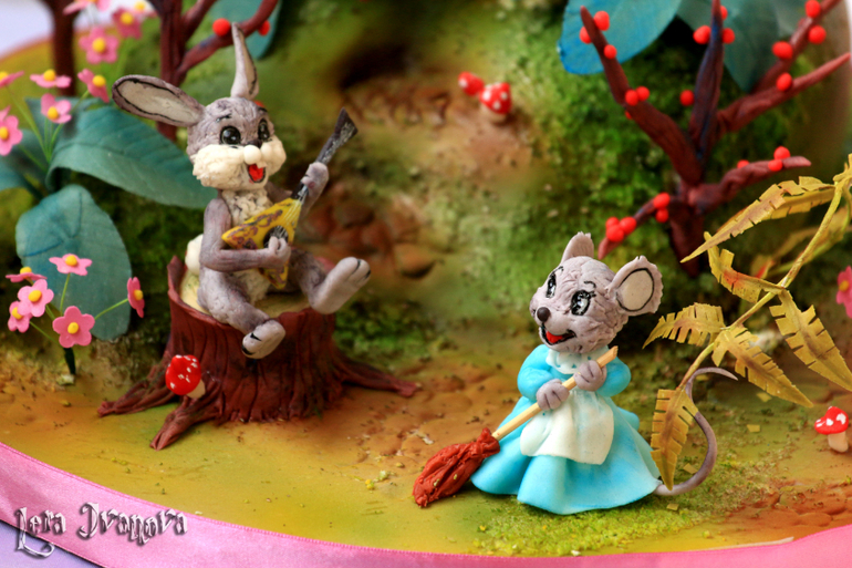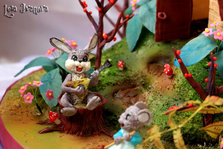 Торты детскиеПокажу ещё один мой тортик, тоже любимый и тоже с зайцем... и мышкой) Делала, по-моему, в конце февраля... или в марте... в общем, этой весной. По мотивам сказки "Теремок" в моей интерпретации. К определённой картинке не привязывалась, сама создавала...) Часть торта сделана не торопясь, а часть уже впопыхах, так что недочёты, конечно, есть существенные. Но всё равно люблю его...)