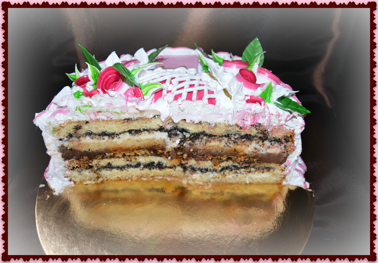 Торты для домашних и друзейВот такой тортик был на мой день рождения. Оформление Елены Петровой, мое только внутреннее наполнение ))) Ванильный бисквит, шоколадный крем "Шантильи" с нугатином из микса орехов, крем из рикотты с маковой начинкой. вес 3200. Украшен белковым заварным.