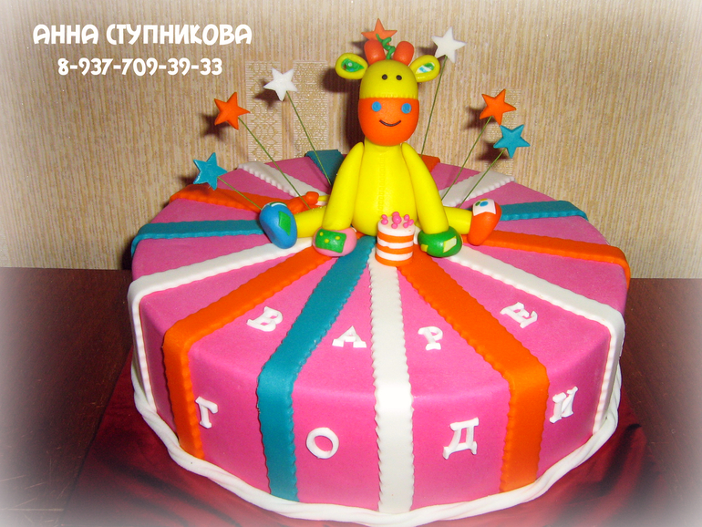 Потом бегом второй торт доделывать, лепить жирафа. Ух денёк весёлый)) Сдала эти 2 торта и бегом начинать торт, который сегодня надо было отдаь в 10 утра. Сделала)) Даже не торопясь. Вчера все вылепила вечером. Сегодня утром, правда, проспала, будильник в 4 утра отключила и вырубилась… проснулась в 6 и бегом… Надо было обмазать торт, выровнять его под мастику, чтоб он застыл… а на это обычно надо часа 4....