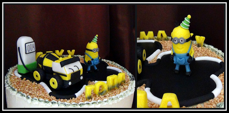 Украшение тортов кремом,шоколадом, фруктамиДолго смеялась, когда попросили сделать самую простую безоколонку с бетономешалкой и миньоном. Шоколад на кипятке, классический ванильный бисквит, крем "Тафита" с орешками, ванильный баварский мусс с прослойкой клубничного джема. Вес 2900.