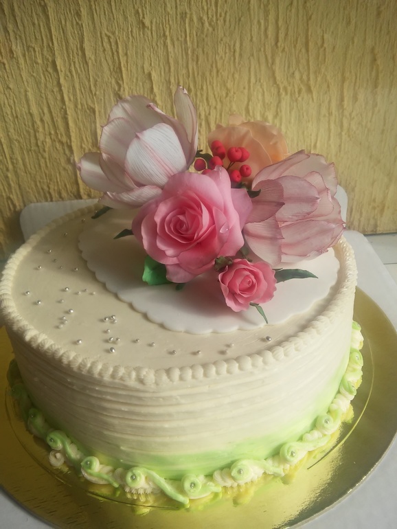 Под цветами просто мастика, вырезана вырубкой. Чтоб цветы не таяли от крема