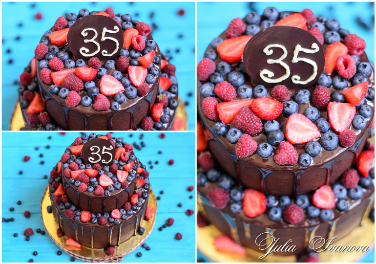 1 ярус-Медовичок со сметанно-заварным кремом, 2 ярус-Три шоколада! Декор- ганаш, зеркальная глазурь и много вкусных и сочных ягод! Вес 4,5-5 кг (не помню уже)