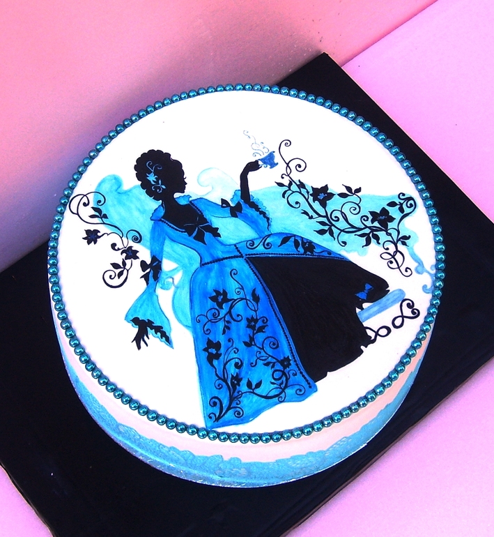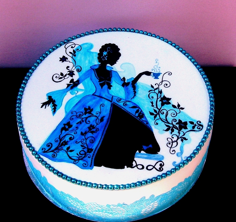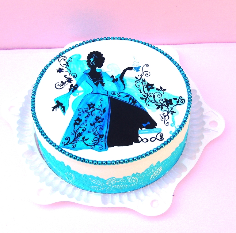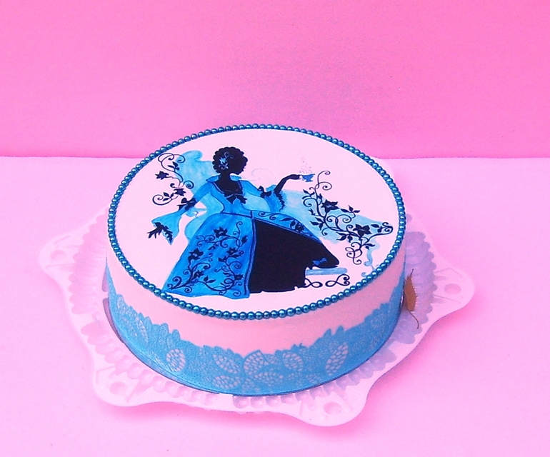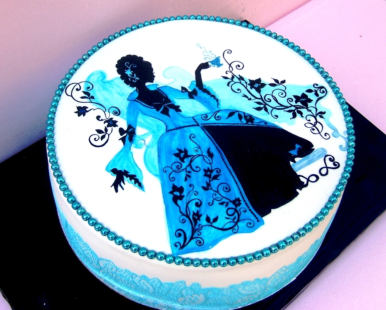 Откровенно говоря тут нет фотки с реальным цветом).. да и у "живого" торта краска дала взгляду немного объема, но никак ни разводов, как на фото. Наслоение было, но ровное с переходом, а тут прямо пятна высвечивает).. но оно и просохнуть-то не успело, честно говоря.. так что, возможно, это и есть причина "пятен" на торте (в смысле на платье))
