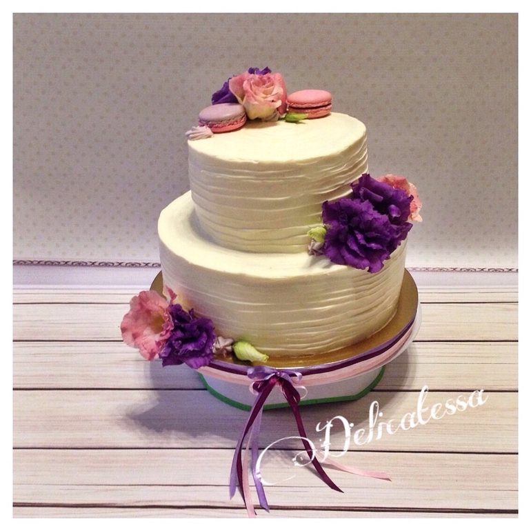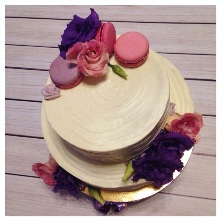 Вот такой лаконичный свадебный тортик, вес 5,5 кг. Оба яруса песочные, со сливочным кремом, домашней карамелью,орешками и вишней. Цветочки, ясень пень, живые ))