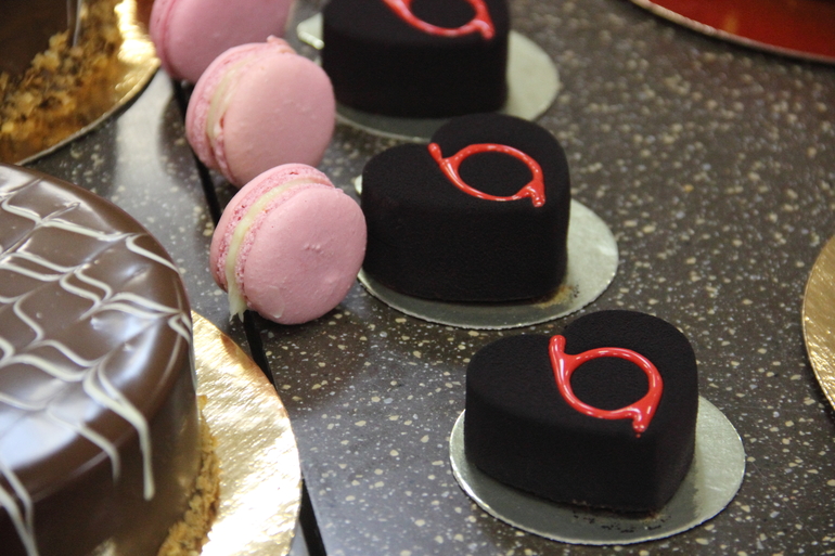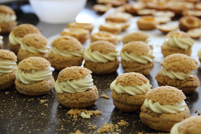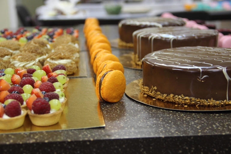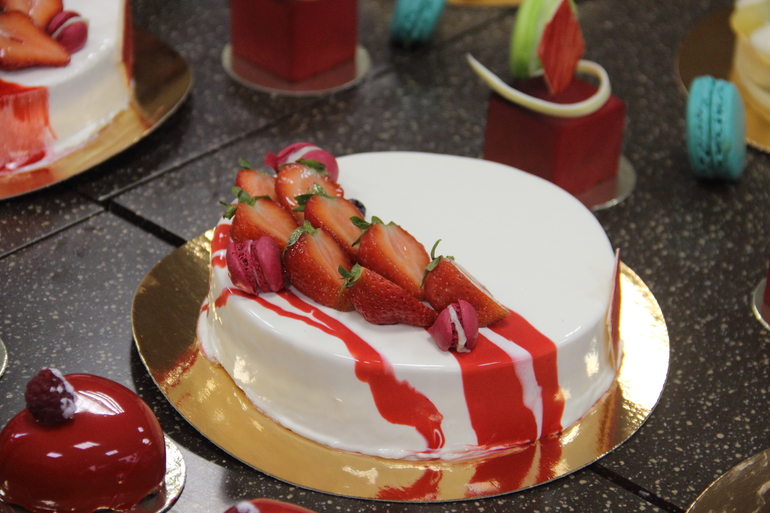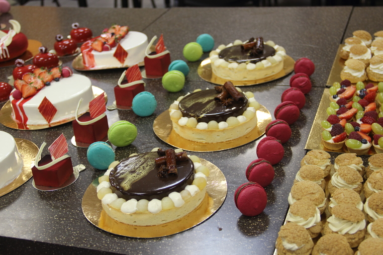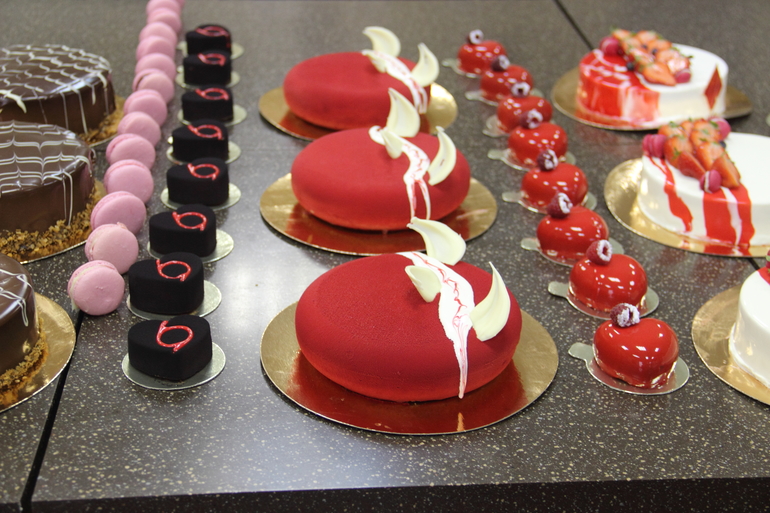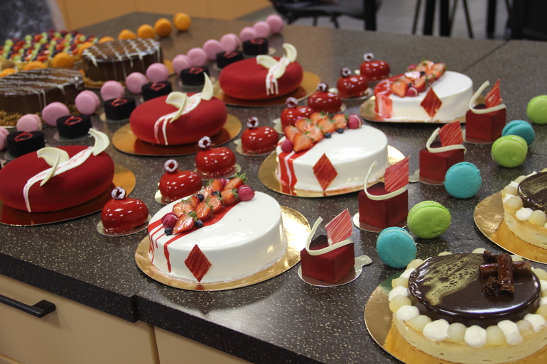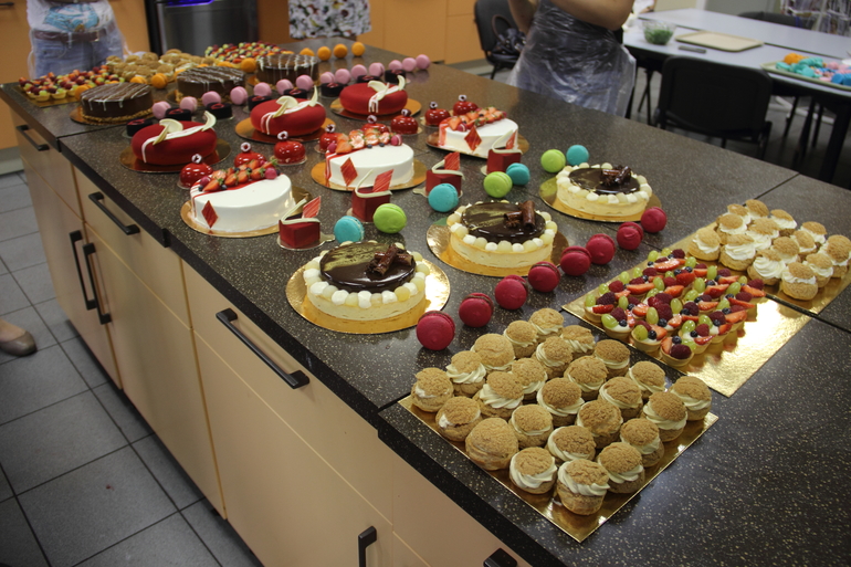 нас было 3 группы по 3 человека-идеальное количество! каждая группа успела сделать полный ассортимент-4 вида торта, 2 вида макарон, шу, тарталетки, муссовые пирожные. еле дотащила огромный пакет сладостей до Твери))).