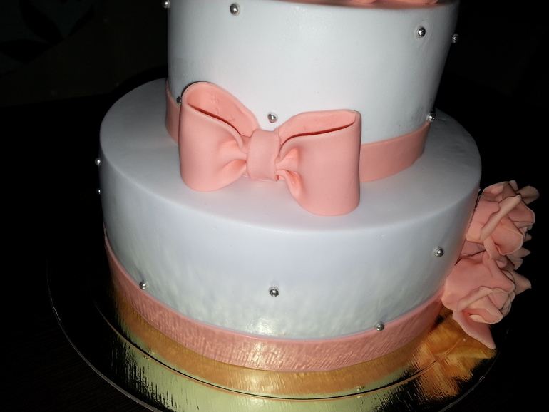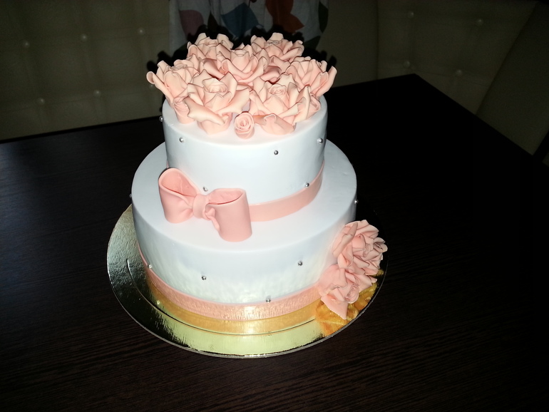 Торты свадебныеКак же я переживала за него! Делать торт на свадьбу это очень ответственно! Но, вроде, не плохо получилось ))) розы, конечно, "хромают", но ничего, и их победим )) Цвет реальный как на втором фото с бантом.