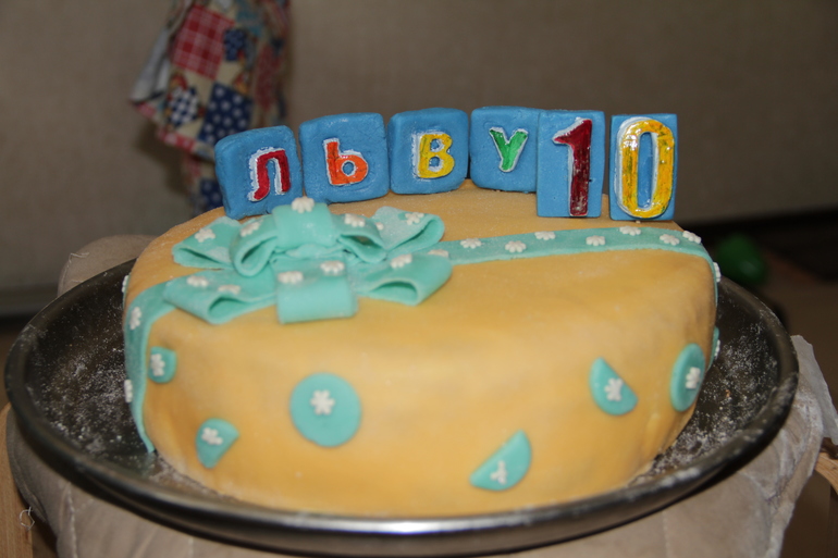 Бантик собирала прямо на торте. В тот момент поняла, что нужно было раньше сушить (до этого только страшненькие буквы заранее сделала). Обязательно попробую потом еще раз собрать.