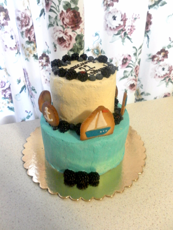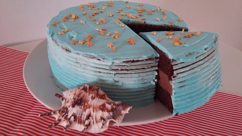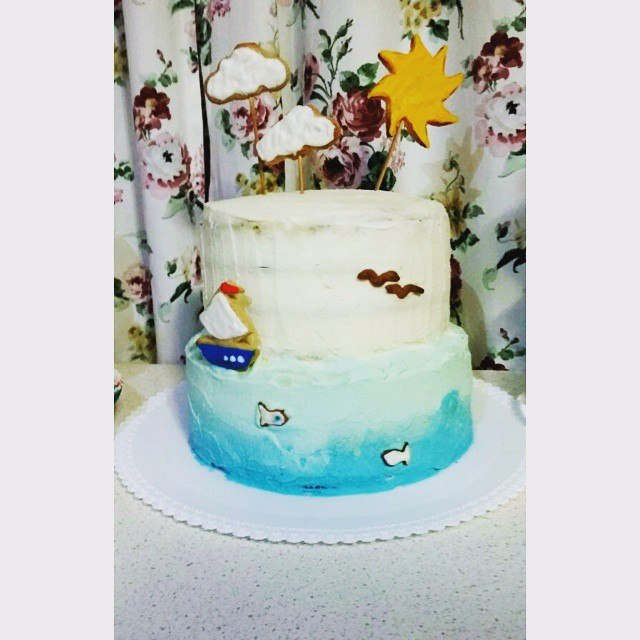 Морской двухъярусный тортик) Верхний - шоколадный бисквит, нижний - колибри с бананом и ананасом, крем чиз, сверху швейцарская меренга на масле) Малыш 2,4 кг)))