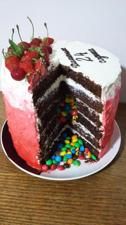 Это для моей сестрены на 10 июня) 5 кг Отмечала на работе, ели 2 дня))) Шоколадный бисквит, крем чиз, сверху крем с маскарпоне. Внутри сюрприз)