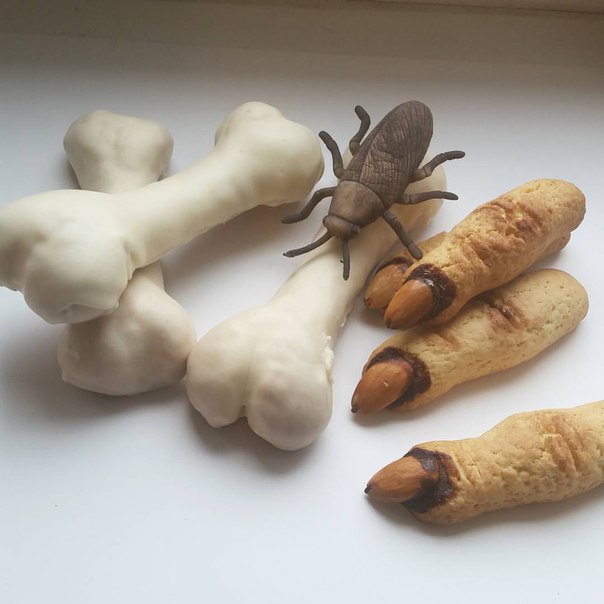 Карамель из изомальта в виде анализа крови (иголки увы настоящие, они для пущщего эффекта, то бишь антуражу))) А так4же печенье в виде всем известных пальчиков ведьмы и косточки покрытые шоколадной глазурью)))