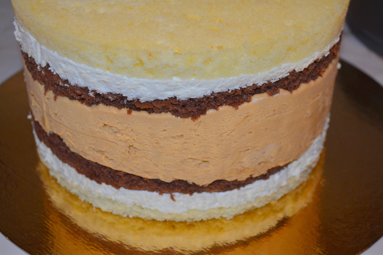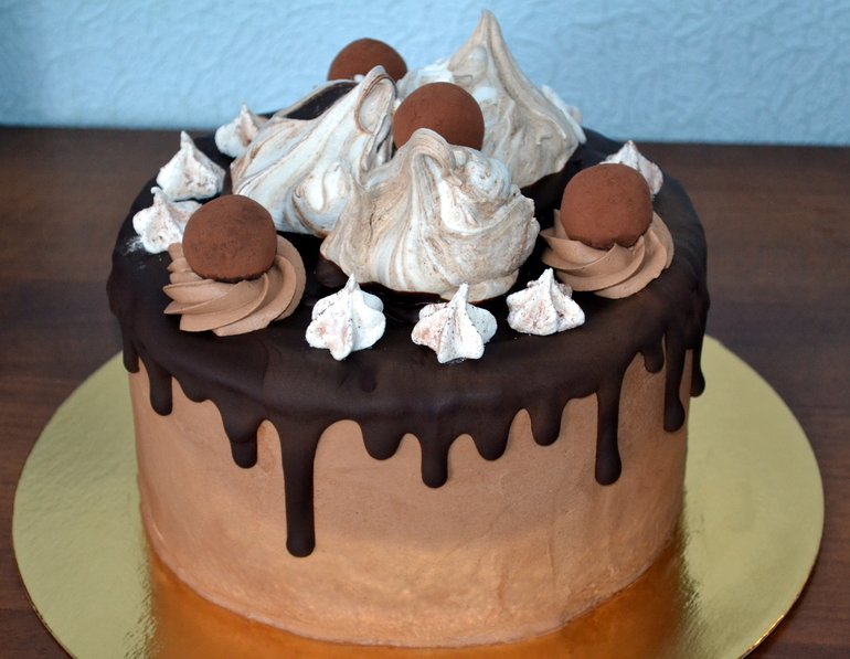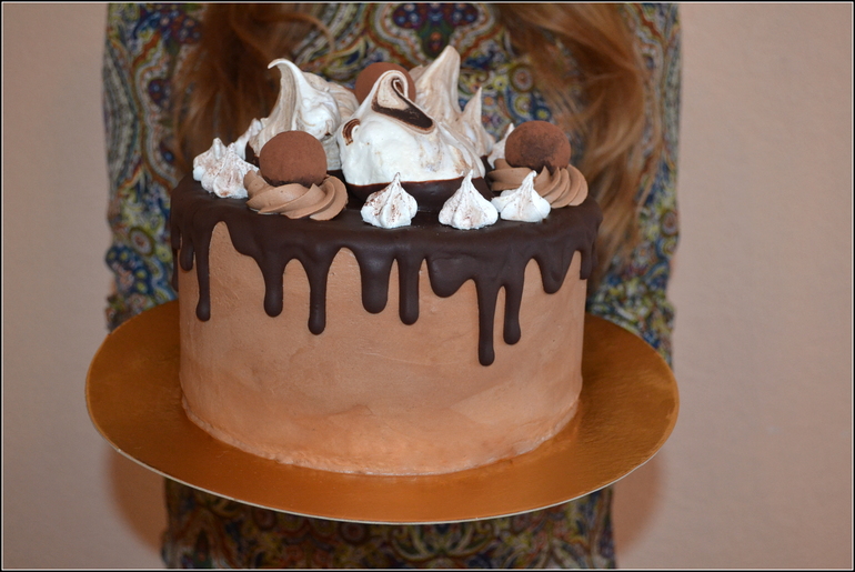 Шоколад на кипятке и ванильный бисквиты, суфле из маскарпоне и вареной сгущенки со сливками, бананы, крим-чиз, кофейная и ванильная пропитки, выравнивала заварным с шоколадом. Безе, зефирки и конфеты.