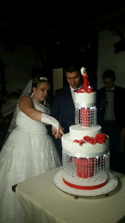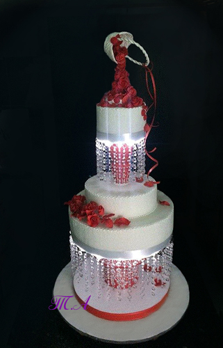 Торт с подсветкой и подвесками ,красные части -фальшярусы,белые съедобные. делала дочке на свадьбу.