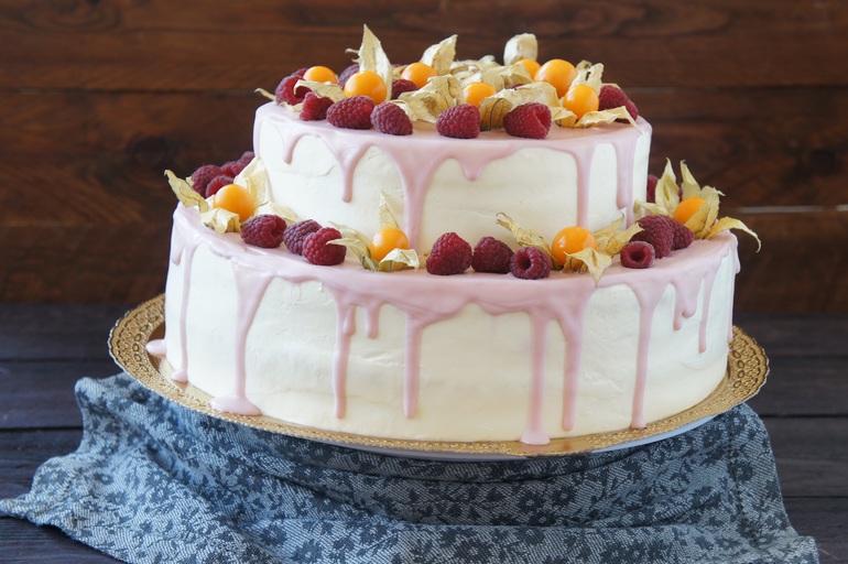 Свадебный.4.5 кг. Внутри верх-морковный тортик с изюмом и орешками, низ ванильные коржи, пропитанные ягодным сиропом плюс ягоды и конечно, сливочно-сырный крем.