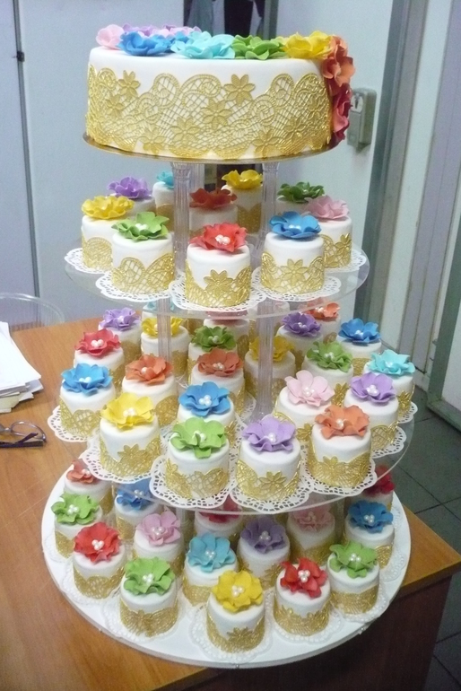 Спасибо Ольга, да пришлось поработать 60 пирожен, все в мастике и кружевах, цветы делала заранее.У меня редко заказывают кексы на свадьбу, чаще мини торты.