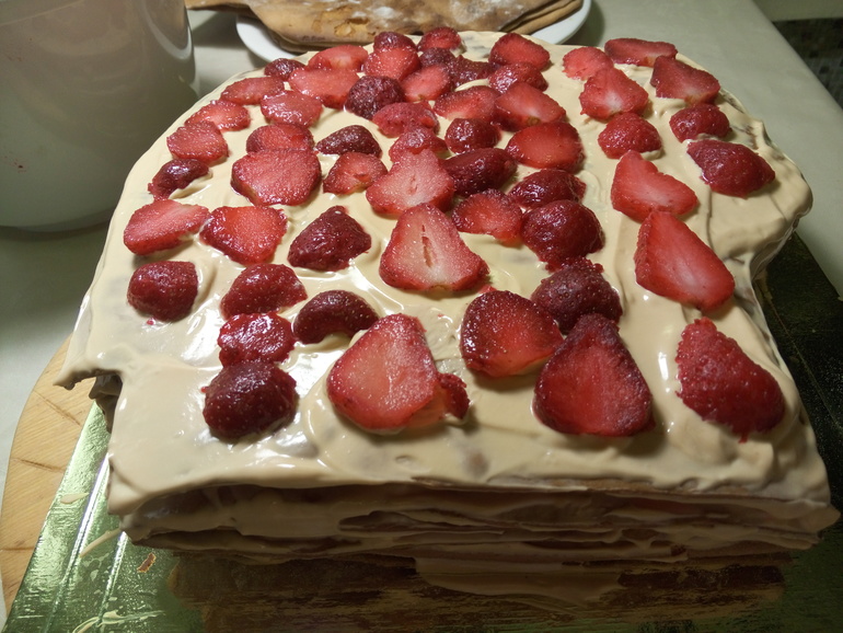 Красиво)), карамельный крем это какой? Первый раз встречаю медовик с клубникой)) клубника свежая или мороженая??? Извините за распрос просто ищу новые рецепты))