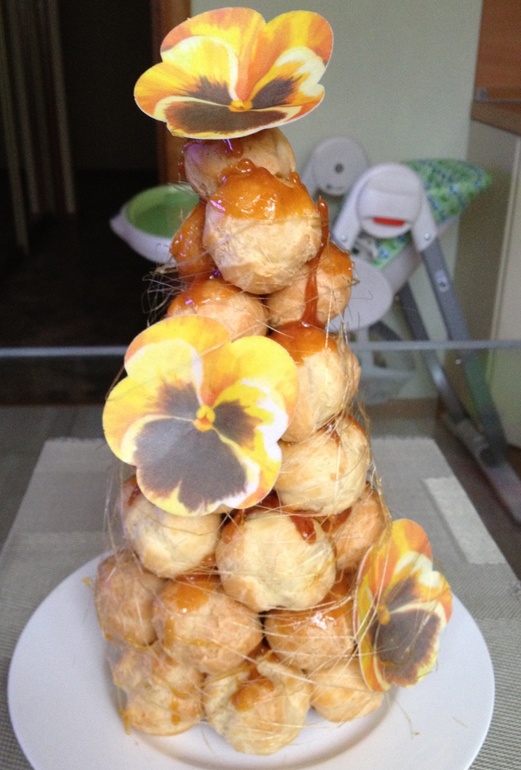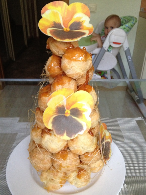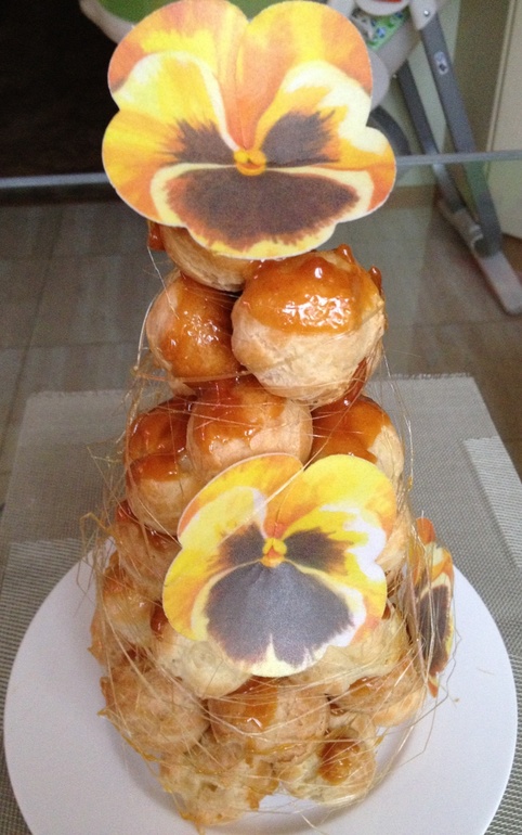 Да, профитрольчики. Внутри заварной крем Патисьер с легким лимонным ароматом и вкусом. Скреплены карамелью. Складываются профитроли в конус, но можно и без конуса обойтись.