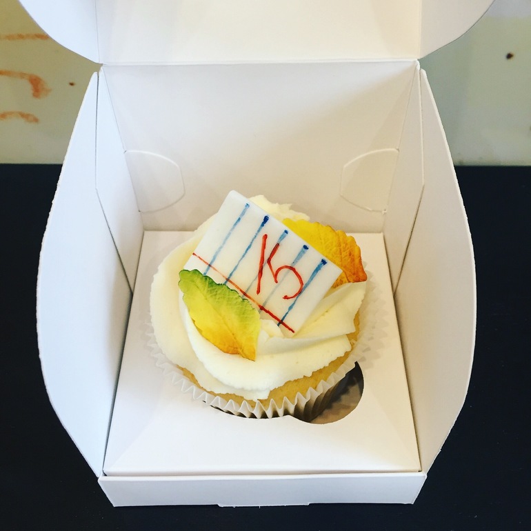 Заказали на чаепитие перед каникулами капкейки в индивидуальных коробочках (да-да, в тех самых, с которыми мне Невкусно подгадил). Сначала заказчица хотела просто пятёрки из мастики, но я предложила вот такой вариант. Ванильные капкейки с клубничной и апельсиновой начинкой и кремчизом.