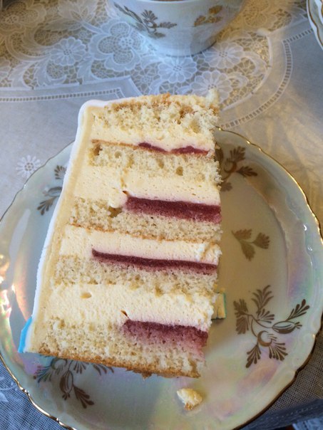 Внутри ванильный бисквит, клубничное кули, баварский мусс на белом шоколаде.