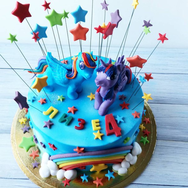 Искорка и Радуга, ох уж эти пони))) Лепила до 4х утра, и недовольна своей лепкой как всегда))) 3 кг ванильного торта с крем чизом и персиками.