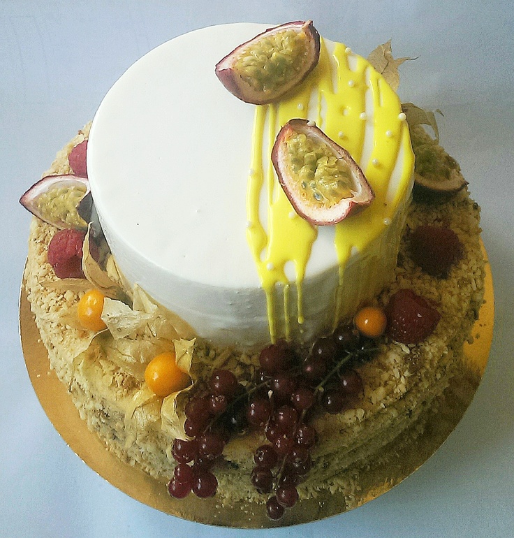 Украшение тортов кремом,шоколадом, фруктамиЭто я про торт. А вот почему Нижний ярус Наполеон с кремом муслин и малиновым конфи. А верхний ярус - чизкейк с белым шоколадом и с сумашедше ароматной маракуйей. И покрывает тортик зеркальная глазурь. И вот они встретились в одном торте, классика и современность. Кстати, вес 3,3 кг.