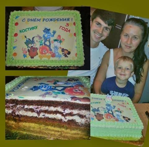 2. Союзмультфильм. Вес 4,5 кг. Состав: шоколад на кипятке, крем сливки с маскарпоне, вишня. Украшен кремом Шарлотт и съедобной фотокартинкой.