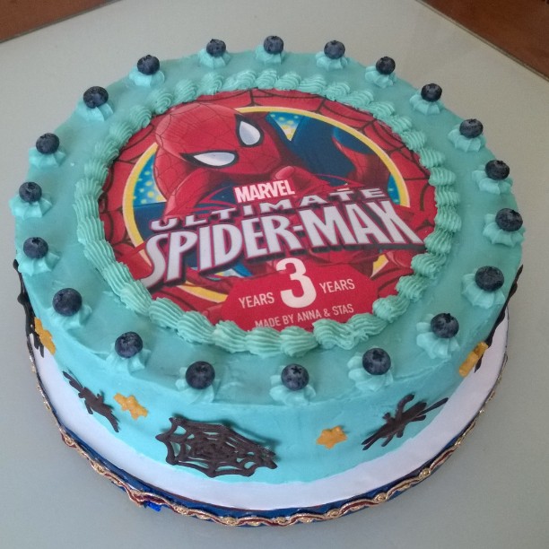 Украшение тортов кремом,шоколадом, фруктами1. Спайдермен. Вес 4 кг. Внутри шоколад на кипятке, крем сливки с маскарпоне, вишня-малина. Украшен сливочно-сырным кремом, шоколадом и съедобной фотокартинкой.
