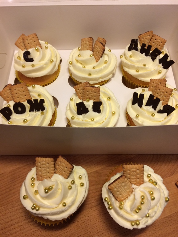 Капкейки и КейкпопсыВот такое милое поздравление коллеги на работе :) Внутри нежные ванильные капкейки с шапочкой из крем чиза и шоколадной надписью:)