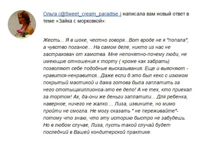 Не расстраивайтесь. Такие люди всегда есть и будут. Заказывают у меня торт, и жена мужу говорит, все это при мне. "Ой, ну давай закажем медовик, его трудно испортить". Мы в сфере обслуживания, поэтому и отношение такое.