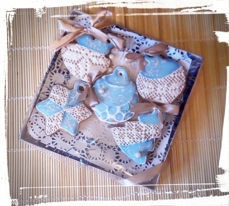 Глазурь получилась какая-то матовая. Использовала производственную вилтон.Ещё мне интересно, где в Москве можно купить вилтоновскую насадку 1s- исчезла из всех магазинов. Расписывала корнетиком с дырочкой без насадки. И где продаётся наполнитель для коробок в виде имитации стружки, тоже не нашла.